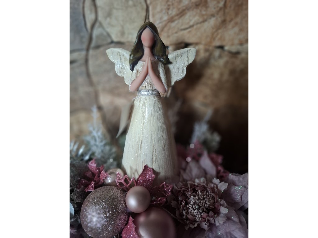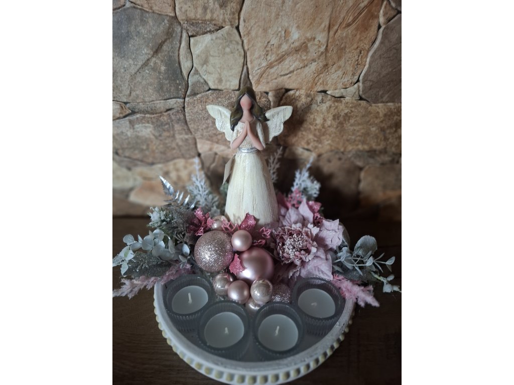 třpytivý adventní svícen na čajové svíčky, průměr tácu cca 23cm, andílek výška 22cm